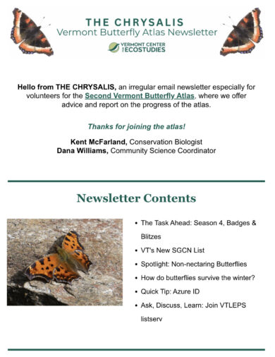 An irregular email newsletter for participants in the Second Vermont Butterfly Atlas, featuring reports on the progress of the atlas and advice and tips. Check out our current and past issues below.